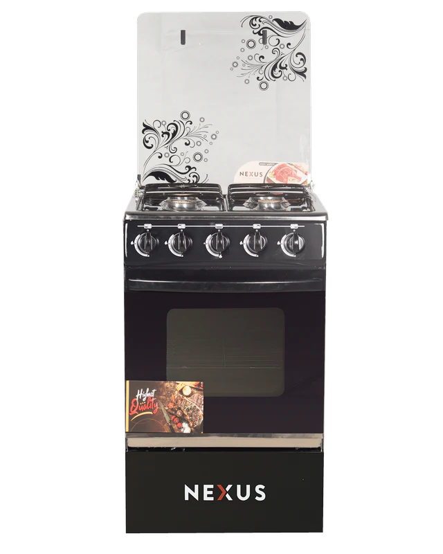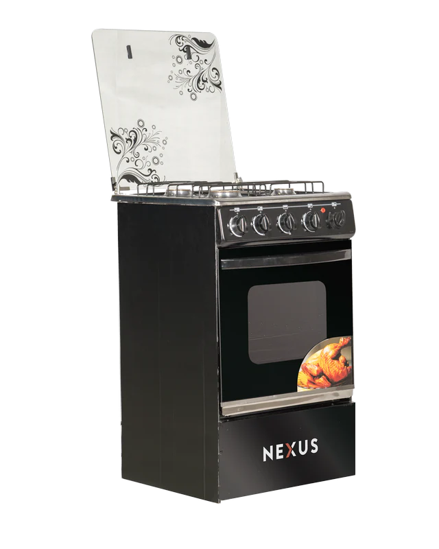 The Nexus GCCR-NX-5055BC(4+0) is a 50×50 cm, four-burner gas cooker with an oven, finished in black. It features auto-ignition for the stovetop and is designed for gas efficiency.Â
